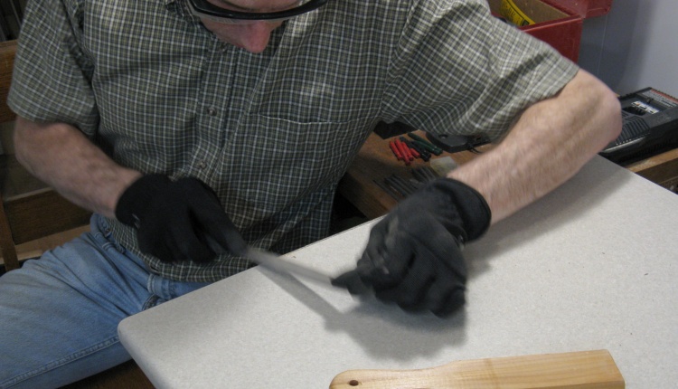 After cutting, the tape is removed leaving the splinters (center section in picture), which are then sanded off (lower portion) to clean up the edge. When cutting without the tape, the splinters are about twice as long.