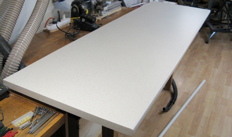 The ends of the top are unfinished but they sell matching laminate pieces for the ends. These come with heat-activated adhesive, so they get ironed on and then trimmed to be flush. After cutting off the excess with tin snips (no, not the recommended technique), the edges were filed flush as shown here.
