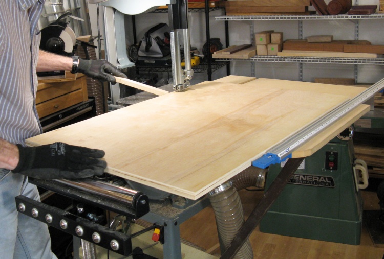 Once a sheet had the larger pieces removed, it could go on the bandsaw for width trimming or making smaller pieces. Here a largish piece is getting an inch or so trimmed off one side.