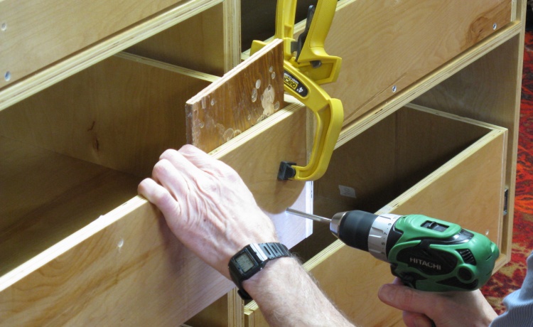 The drawers needed to be drilled to accept the three screws that would secure each front. I clamped on a backing board and drilled these by hand.