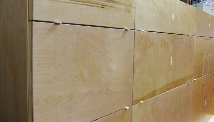 Then the nine drawer fronts were set in place and spaced with little pieces of 1/8-inch-thick plywood.