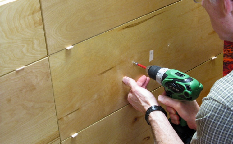 Then with all the fronts positioned exactly where I wanted them, I drove screws through the handle holes into the drawer fronts. These screws would only be used to hold the fronts in position temporarily.