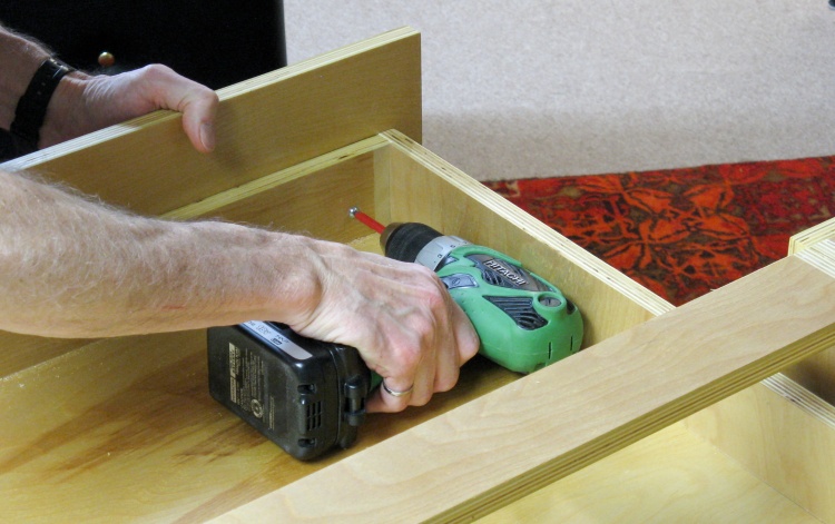 The construction of the drawers automatically kept them square, so it mostly was a matter of screwing everything together. Any glue squeeze-out was just wiped off the varnished surface with a damp cloth.