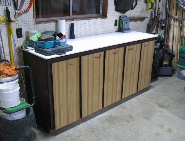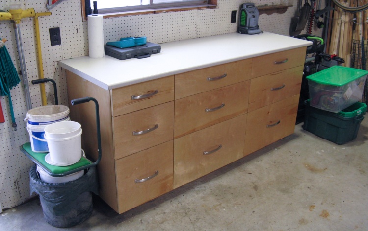 I was rather thin on cabinet-building experience so I checked out typical construction on-line and visited my brother who is something of an expert, having built a number of cabinets including those for a deluxe kitchen. That research mostly answered my jointery questions and then the other main decision was choice of material: I had originally envisioned using melamine, but after a bunch of dithering detailed comparitive analysis, ended up settling on plywood primarily due to better moisture resistance; melamine swells up significantly with moisture - for example a spilled jug of windshield washer fluid.