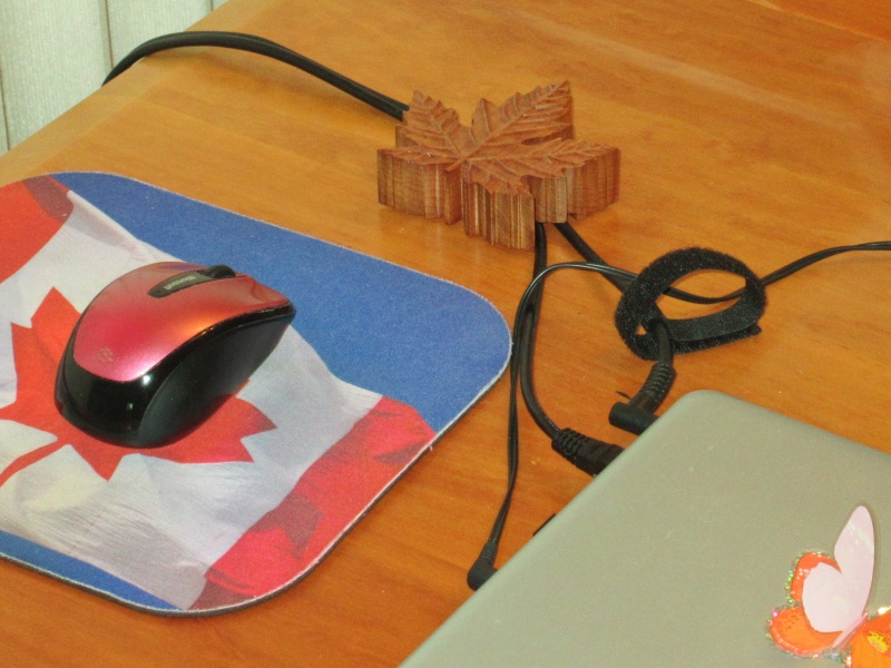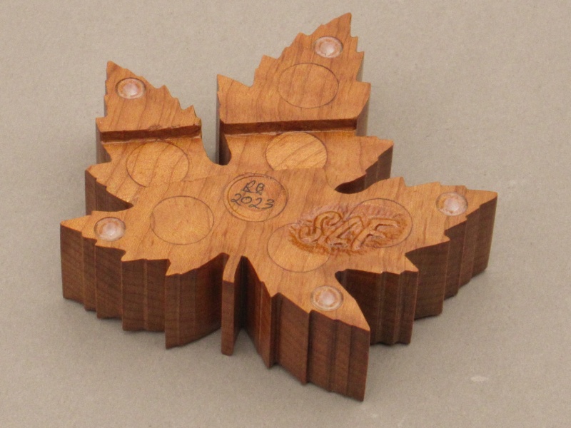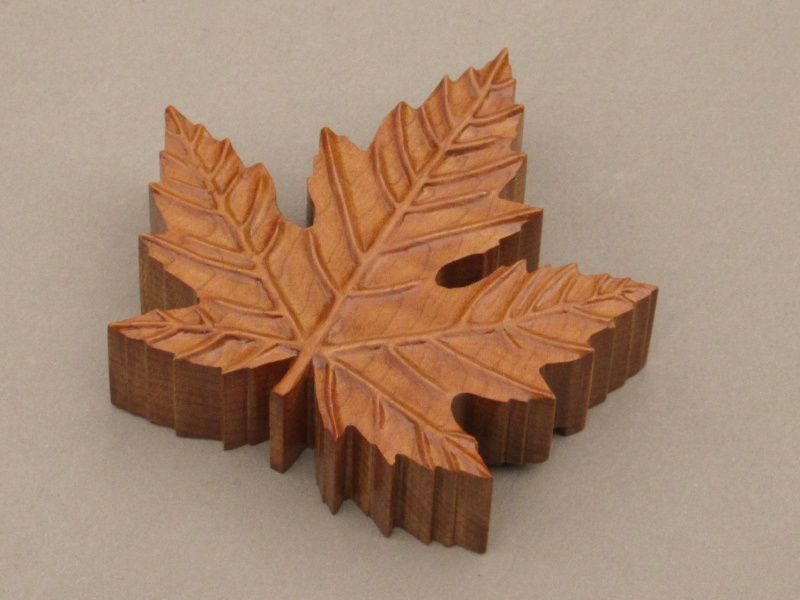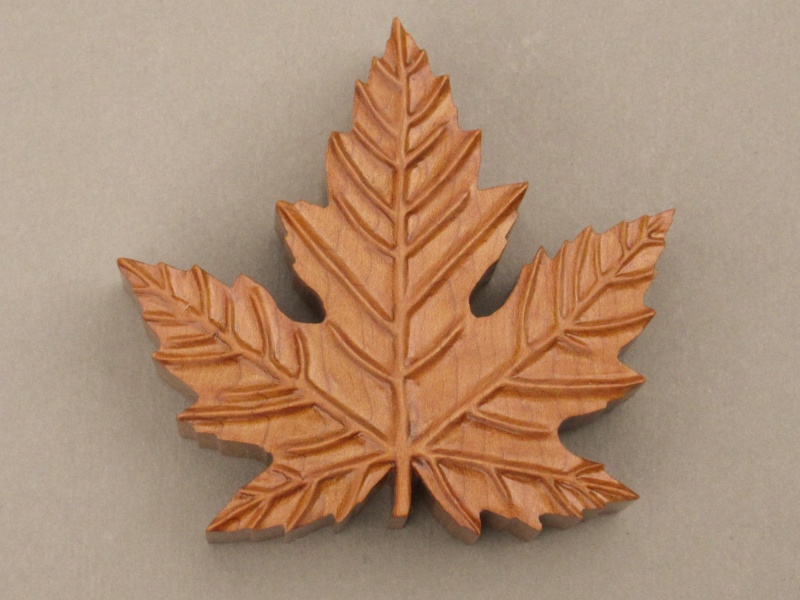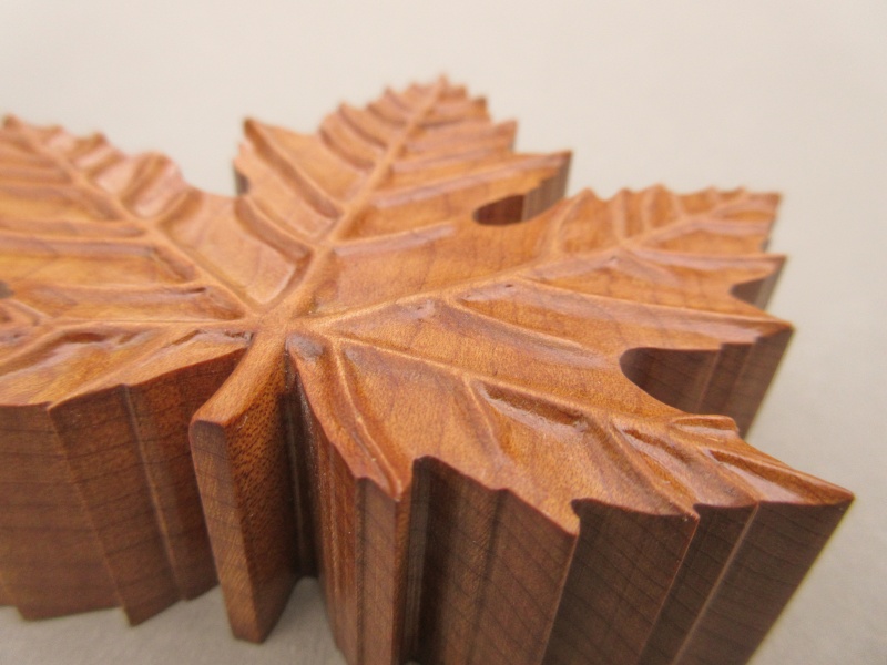 Upon consultation, she was good with a new wooden cable restraint as a more-decorative replacement. To avoid diluting the Canadian-ness added by the hockey puck, I decided to go with a Maple leaf motif. It might have had a certain satisfying symmetry if I'd selected Maple for the wood but I decided to use Cherry instead just because it's a nicer wood. For the design I opted for a realistic shape; it was