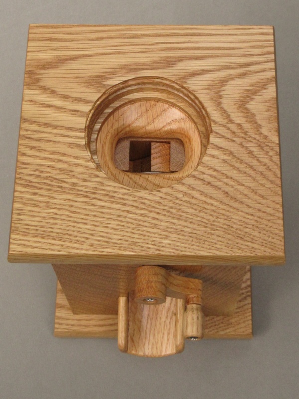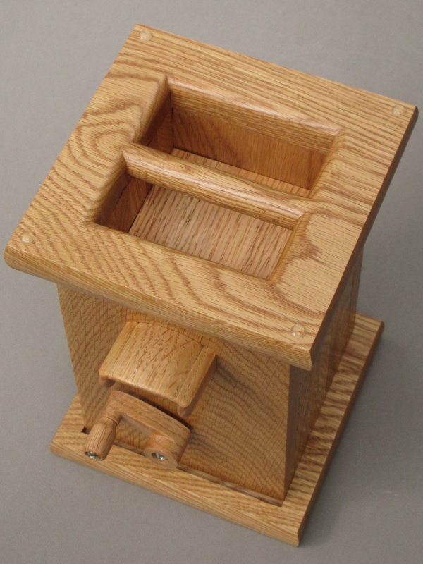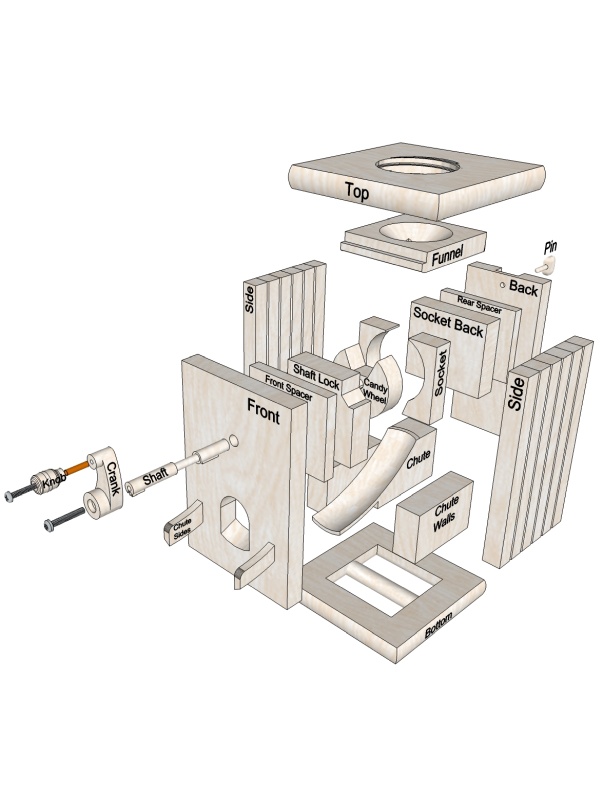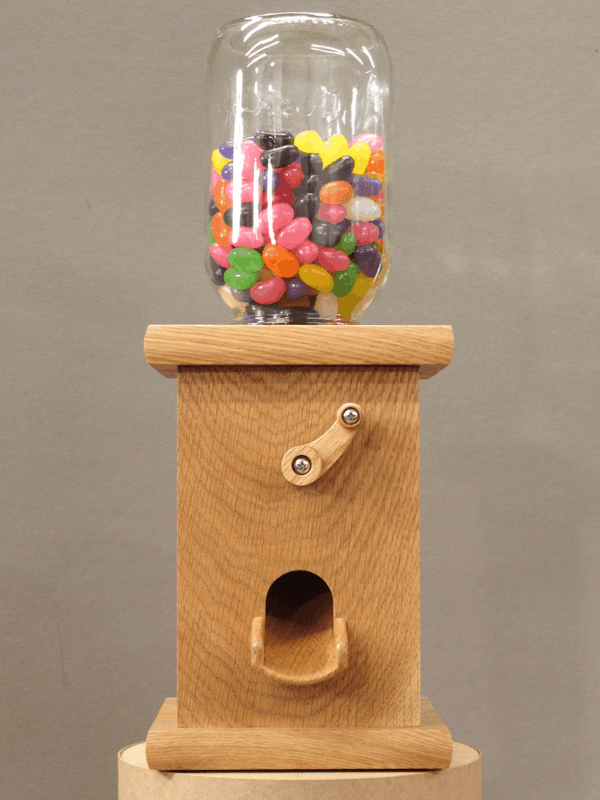 I presented a few design options and shortly we had settled on some features (internal chute, rotary actuator, dark wood) and then I got to work on the drawings. To hold the candy, the machine uses a standard one-quart Mason jar which just screws into the top. The innards are mostly solid wood and are largely just glued together but the top can come off with the removal of a locking pin which allows one to address any critical candy jams.
