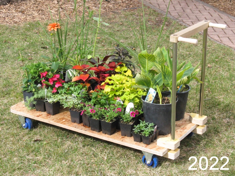 In 2022 the original crude cart was busy supporting some very heavy junk and wasn't available for garden use so this gave me a good excuse to build another. Like the 2021 model this used a 2-ply OSB plywood deck but I used smaller 4"-diameter casters for the wheels (smaller wheels = less space to store). When we'd bought our plants this year, I used a push-from-behind cart at the greenhouse and liked its maneuverability so