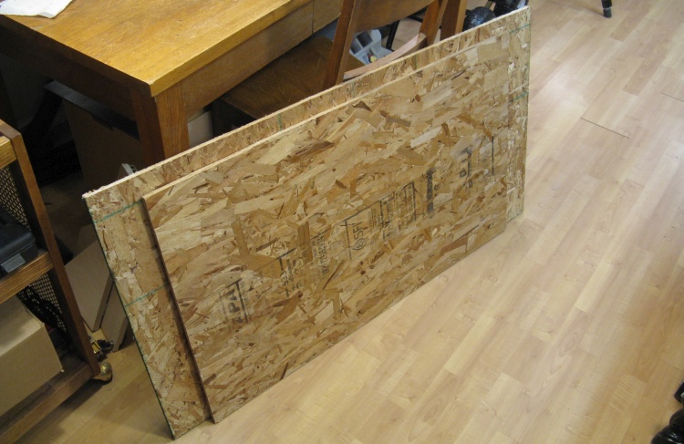 I planned to make the deck from a couple layers of 1/2" OSB plywood. I grabbed the pair of scraps shown here, left over from shed building in 2018.
