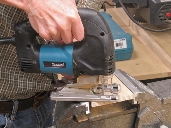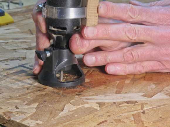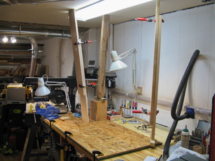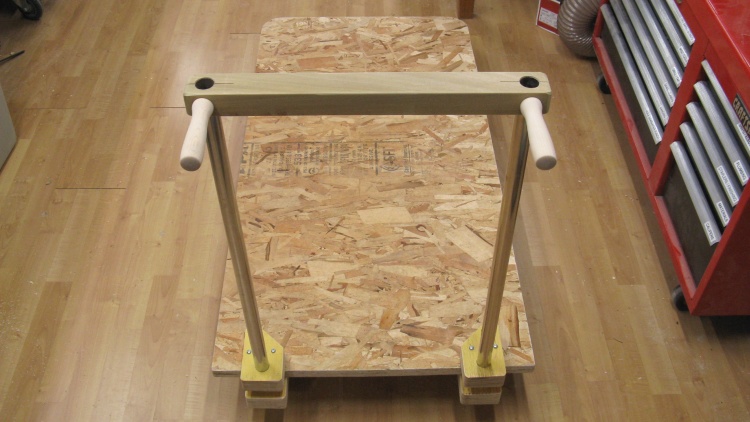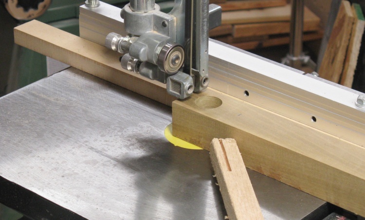 The top birch crosspiece joins the two vertical posts and holds the handles. Here I'm cutting a slot for one of the posts.