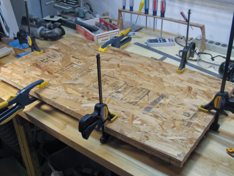 Now on this web page it is only about 9 photos ago where I found that regular wood glue didn't work well for OSB. But in real time it was about a year, giving me more than enough time to forget. So I used regular wood glue which again was a poor choice. Fortunately I had clamped it better so the adhesion wasn't too bad. I had to add a bit more glue and reclamp one edge but the sheets seem to have bonded Ok in the end.