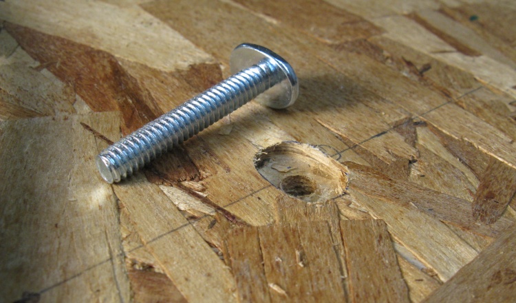 The axle mechanisms needed to be mounted using bolts but I didn't want heads protruding through the top side of the deck. I happened to have a number of #10-24 T-bolts, which have a flat head made to slide into a T-slot. The head is only maybe 0.1" thick so they could be inset flush to the surface without removing much of the plywood.