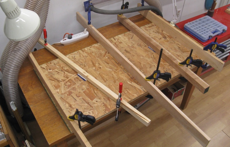 This is of course the shot of the initial gluing operation with five cauls providing pressure every foot or so along the sheets.