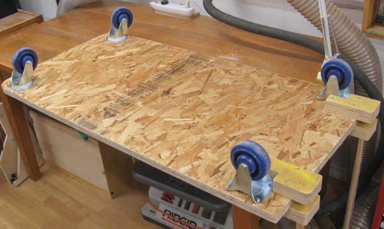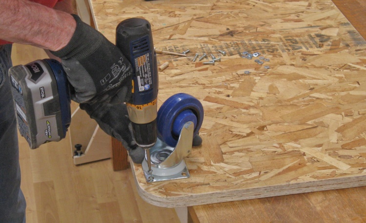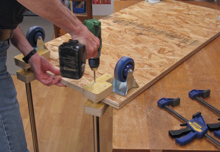 After drilling pilot holes, the casters were fastened in place using #10 x 1" wood screws equipped with washers.