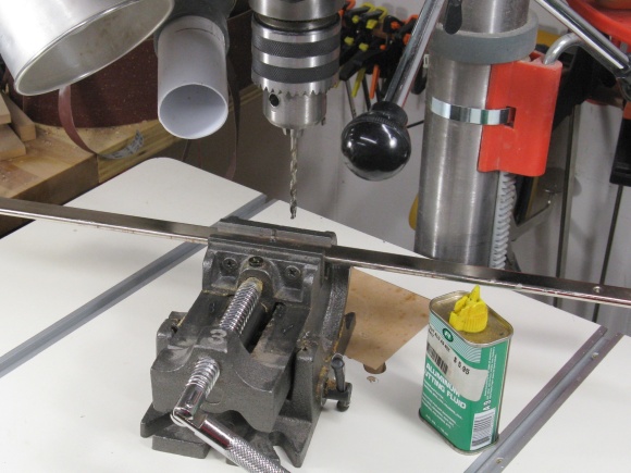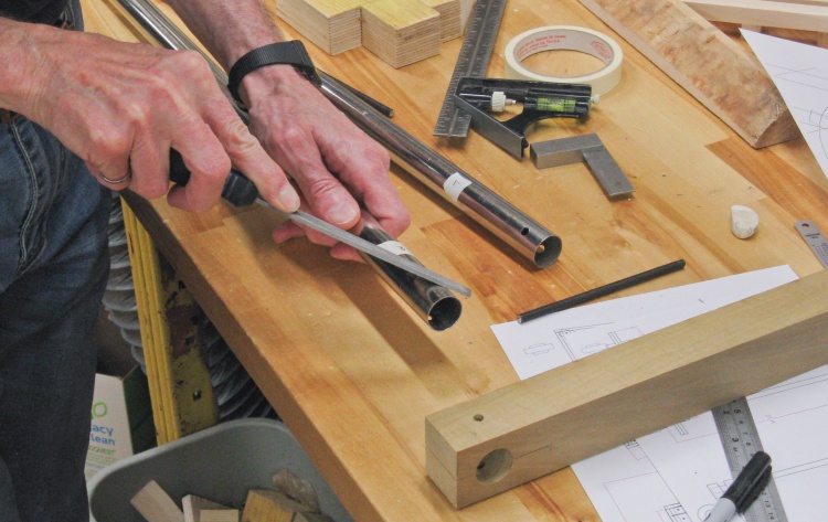 The pipes were cut to length and then had 1/4" holes drilled in the top end. In this shot I'm filing off the burrs from the drilling operation.