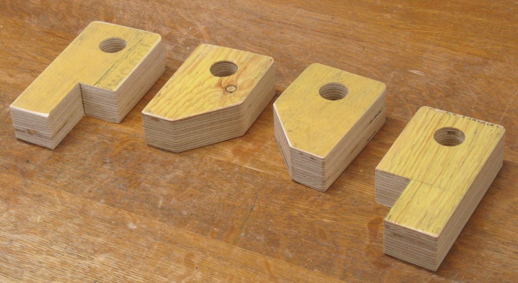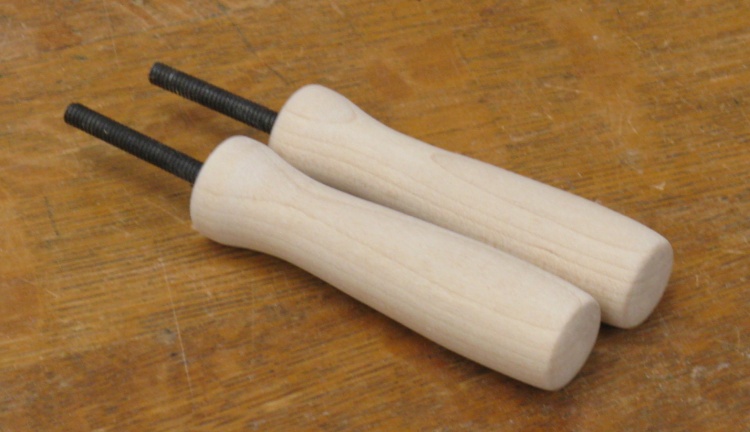 I tapped the handles and threaded in the 1/4-20 rods but the hold was poor (probably due to having them go into end grain. So I drilled larger holes and screwed in threaded inserts, followed by threading in the rods again.