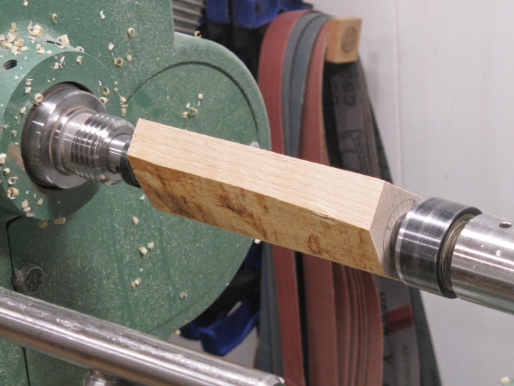 The last bit was a pair of steering handles. I grabbed an irregularly-shaped piece of birch (provenance: probably wagon parts or cart parts from 2016) and mounted it on the lathe.