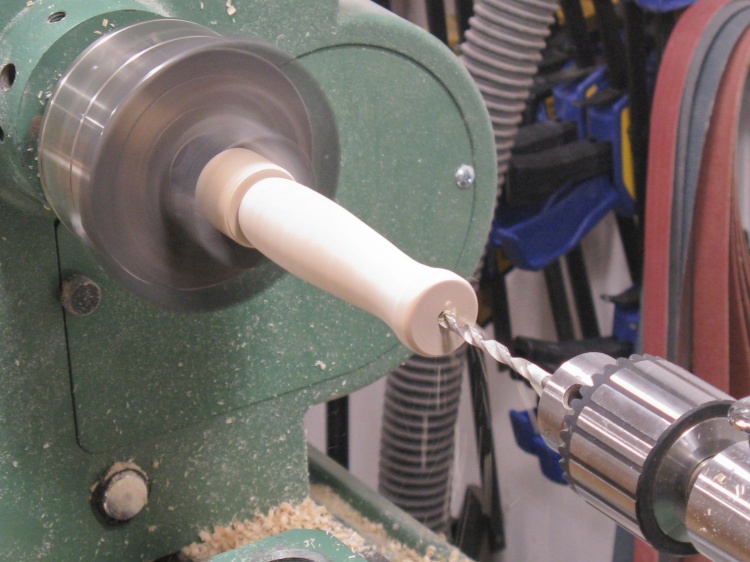 That was turned until it looked handle-y (modelled on a burnishing tool handle) and in this shot it is being drilled for a threaded rod which will be used to attach it to the crossbar.
