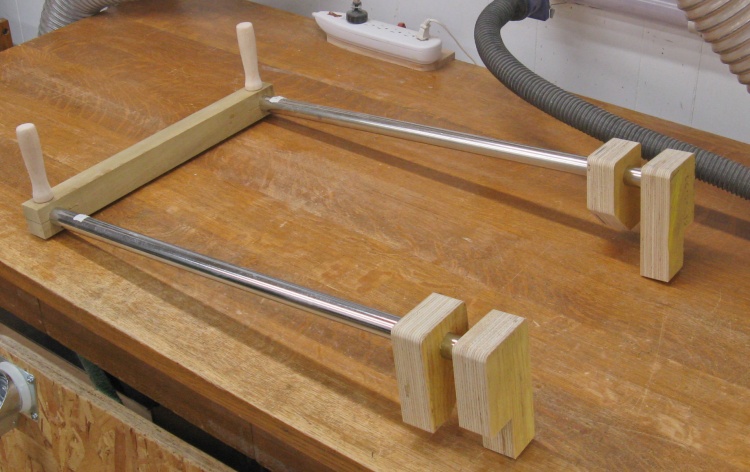The back side of the crossbar was equipped with hammer-in threaded inserts for the 1/4-20 rods. The handle threads were inserted through holes in the crosspiece and rods and into those inserts. Tightening up the handles squeezed everything together at the top.