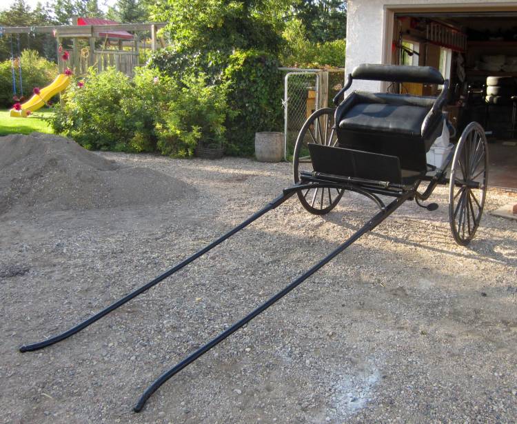 Of course the shafts are the long wooden poles extending from the cart to beside the horse. In practise the rigid shafts allow the horse to turn the cart and also to slow it down. The shafts go to either side of the horse and are often curved outwards at the front (but not in this model) to give the horse more room to turn. The shafts are not used to actually pull the cart; that is accomplished with stout leather straps ("traces") connected from the horse's harness to the cart. Or more specifically to the whiffletree of the cart (or whippletree or singletree or even swingletree). Ya gotta love the terminology.