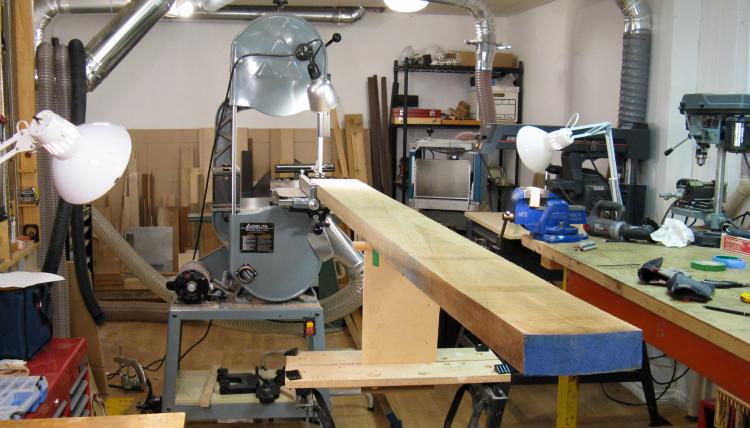 With a bit of rearrangement I was able to make enough room both ahead and behind the bandsaw to fit the board. I have a couple of adjustable rollers to support the wood but they are both behind the saw so I jury-rigged another with a Workmate and some scrap wood for the front.