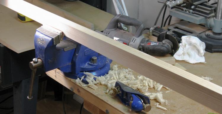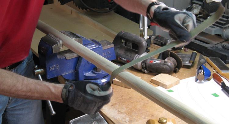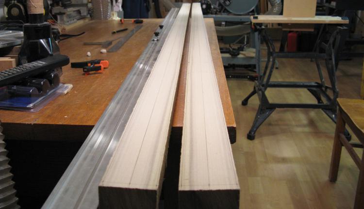 To make straight shafts and with the proper contour, a centerline and outlines were marked using the long aluminum straightedge shown beside the boards.