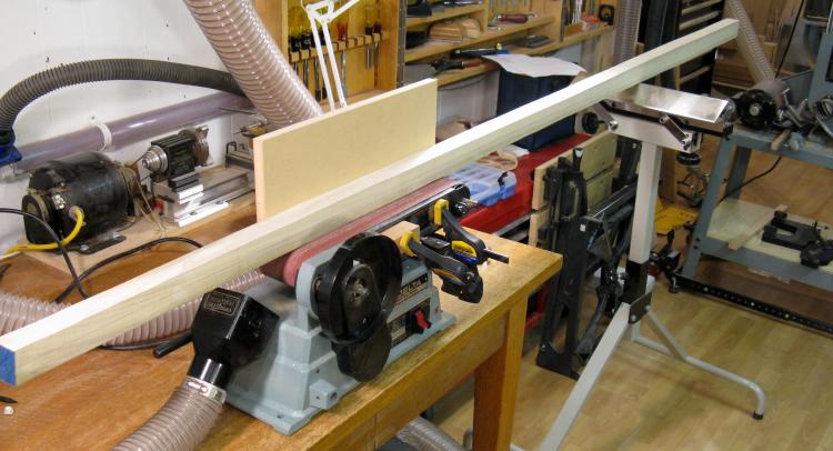 The first step was to cut the width of the shafts to the marked profile by hand using the bandsaw. The next step shown in this photo was to sand the resulting imperfect edges down to the line. I rigged up the belt sander with a flat wall to make sure the sanding was at right angles to the sides, and then just moved the shaft by hand. This let me get the shape pretty close to the lines.
