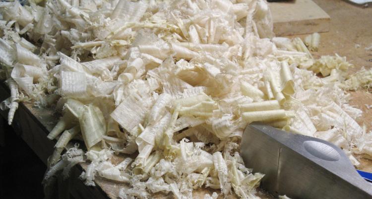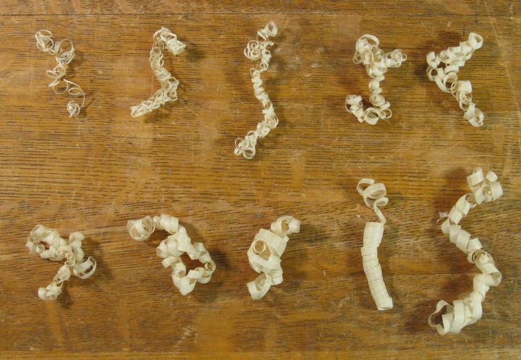 Shaving the corners made a nice selection of curly shavings that varied in width as the corner was flattened out. It took about 10 strokes to get to the desired depth on the octagonal shape and here I put aside one 10-stroke sequence of shavings just for the heck of it.