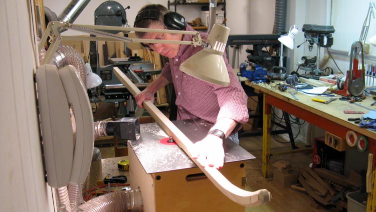 After cutting out the arms close to the lines with a bandsaw, they were then sanded down to the marked lines using the spindle sander shown here.
