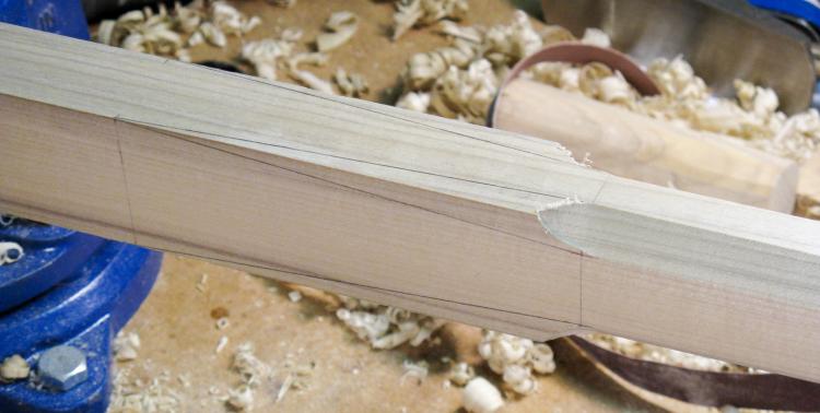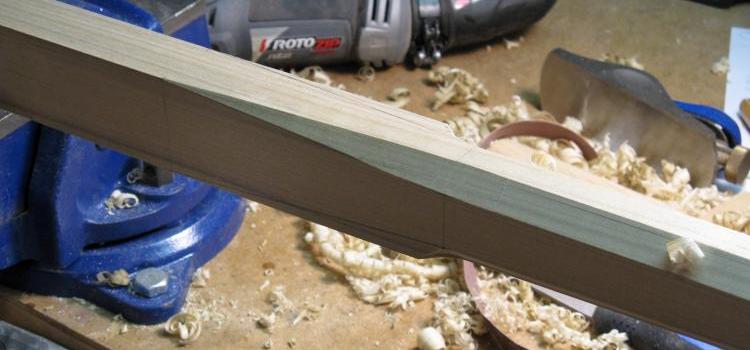 Since the sanding was less effective when shaping the angled portions, I needed to touch up those sections where the width changed from 2" to 1.375". I was able to use a small block plane and a spokeshave to smooth those regions out.
