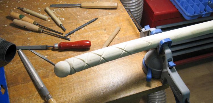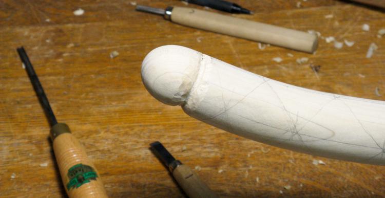 The end looks unfortunately phallic at this partially-done point but further carving moved it solidly towards the "decorative" end of the spectrum.