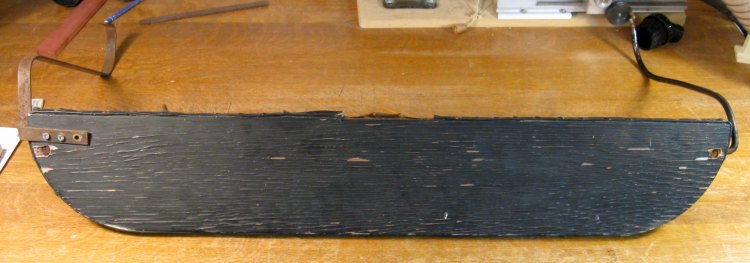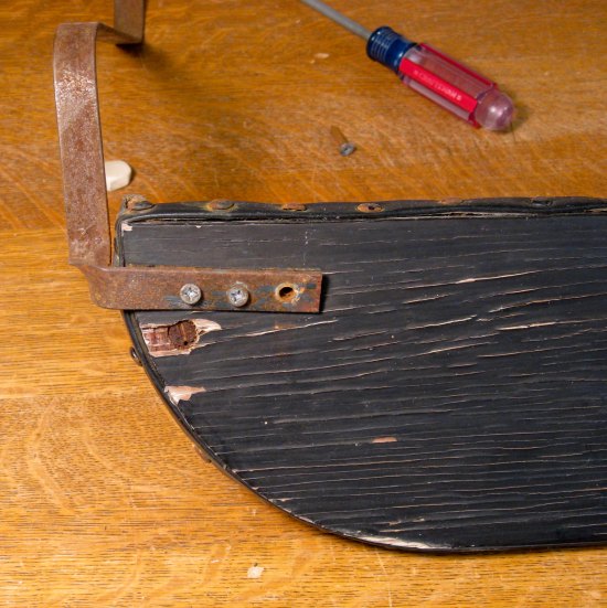 The backrest had its old crackey paint sanded off and the filled holes smoothed over. I used the new and rejuvenated tacks to reapply the leather trim.