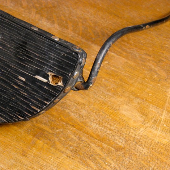 The cart has a short seatback with a separate higher backrest that mounts on a center bracket. The "arms" that it was fitted with were really more brackets to prevent the backrest from pivoting. One which I assumed was the original consisted of a 3/8" metal bar bent and fastened at each end. It attached to the backrest with the upholstery leather formed neatly around it. On the other hand (literally) the second arm was an obvious replacement, being a flat rusty metal strap screwed directly to the backrest.