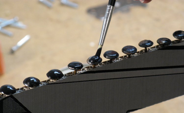 About all that was left to do before cart assembly was to tack the leather trim back on to the backrest. Many of the old tacks were bent and rusted and the only replacements I found were brass rather than the black of the originals. So rather than searching further afield, I just painted the heads black as shown here (and also touched up some old tacks I was going to reuse).