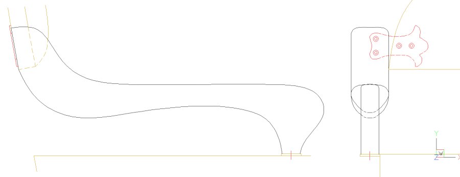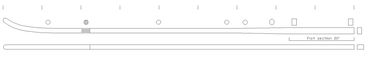 The finished shafts would be a consistent height but the width varies from 2" at the mounting end to 1.375" for most of the length of the shaft, with a section about 20" long where the shape transitions between the two profiles as in the foreshortened outline below.