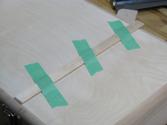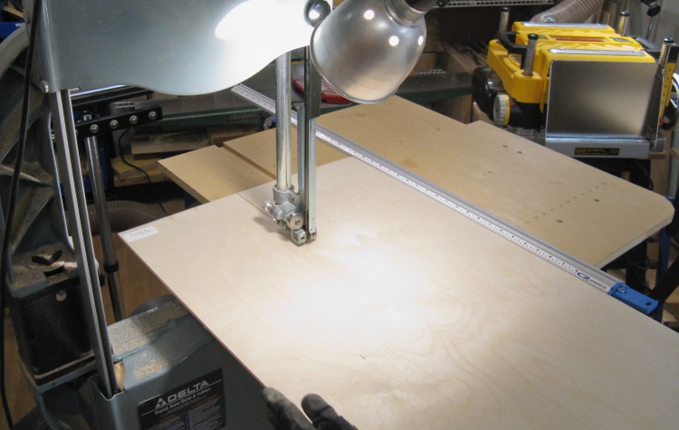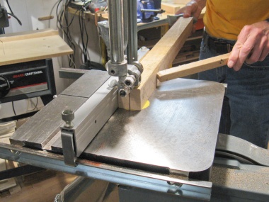 I started by ripping* a strip with a width equal to the short dimension of the case. Here I've attached my sheet-goods table extension to the bandsaw, a necessity for the tablesaw-lacking woodworker.