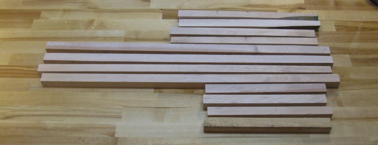 The output of the above operations was this group of a dozen pieces that included long pieces for the long sides, short pieces for the short sides and medium-length pieces to be cut up to make the corners.