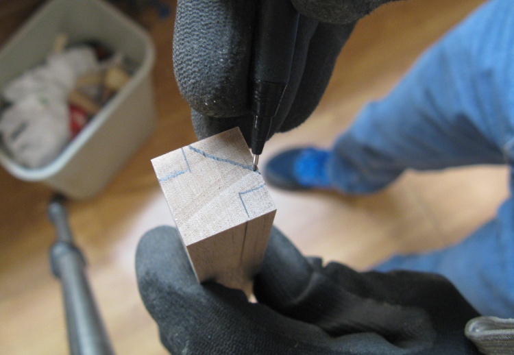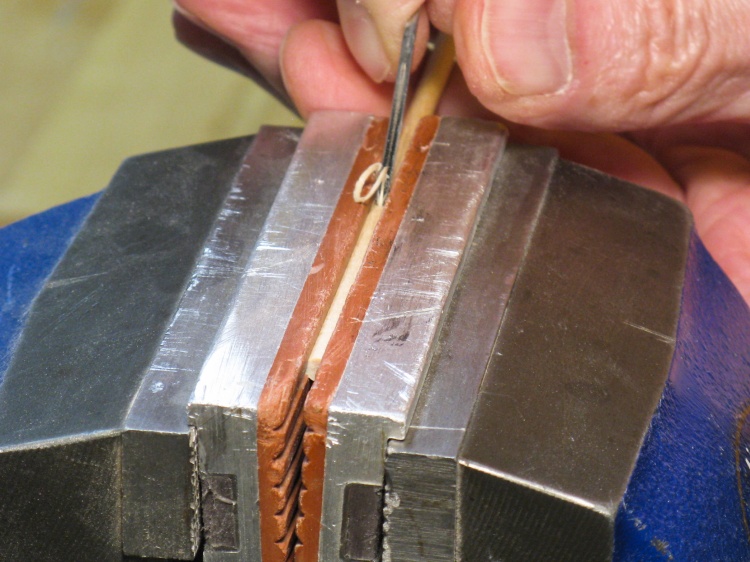 I happened to have dowels of 0.15" diameter so those became the raw material for the pins. Usually joint pins are grooved to increase glue area and prevent an airtight seal. My dowels of course were smooth so I used a tiny V-groove tool to carve four grooves along the length.