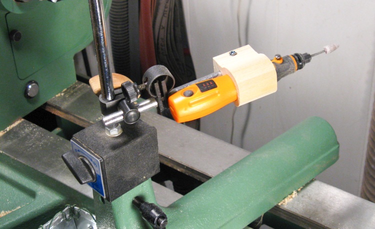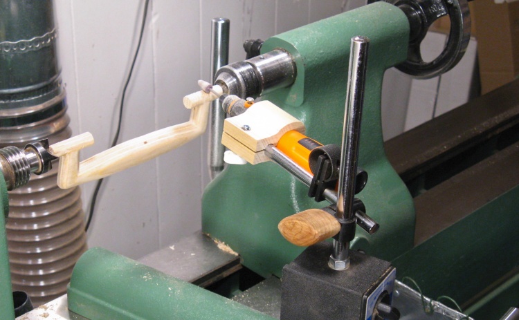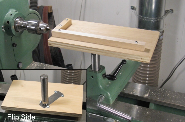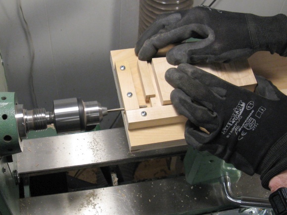 I was going to need to drill the ends of the long frame pieces, something tough to do on a drill press. Instead I made a horizontal drilling jig for the lathe which was just a suitable framed surface mounted to a screwed-on attachment for the lathe banjo (AKA tool rest base).