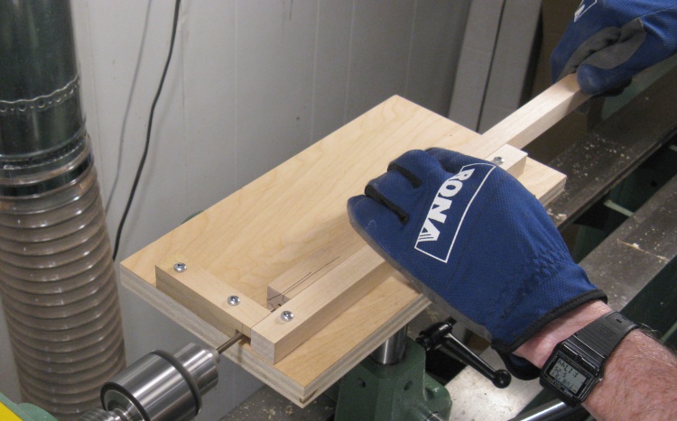 Here I'm drilling one of the long frame rails. The wood is held against the side fence and pushed into the drill bit. The front fence position relative to the drill bit tip determines the depth of the hole.