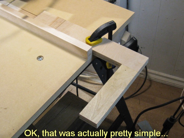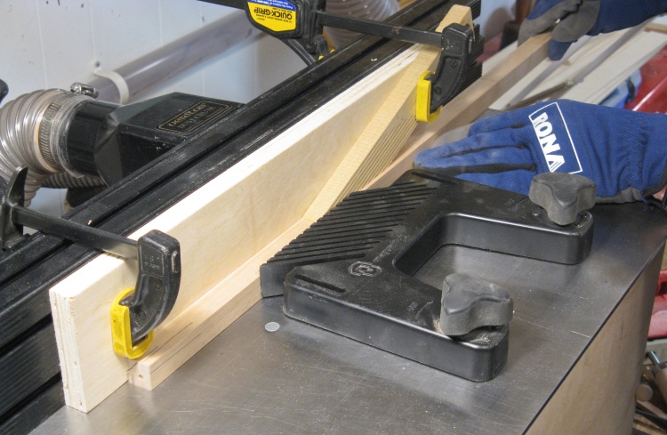 My two narrower strips were crosscut* to the proper lengths using the radial arm saw, equipped with a makeshift stop to determine cut length. Maybe I should make a "real" stop some