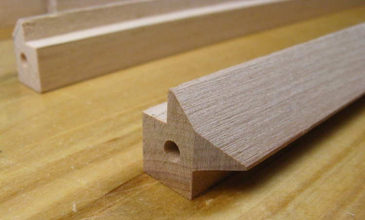 The square profiles of the pieces shown above need to be transformed to match this image which shows the profile of a frame piece. The lower left corner will eventually become a rounded outside corner of the case. The end includes a hole for a small pin to join it to the corner piece, and a bevel to match up with the adjacent side piece.