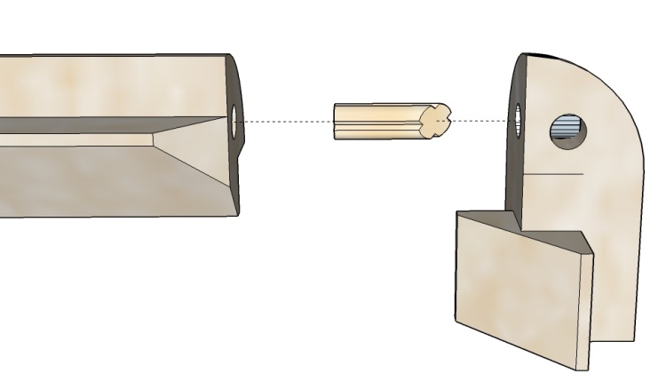 This illustration shows the grooved and bevelled pin as it fits between corner and rail pieces.
