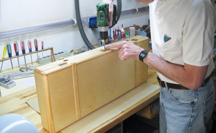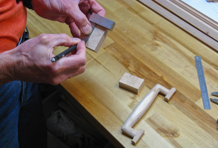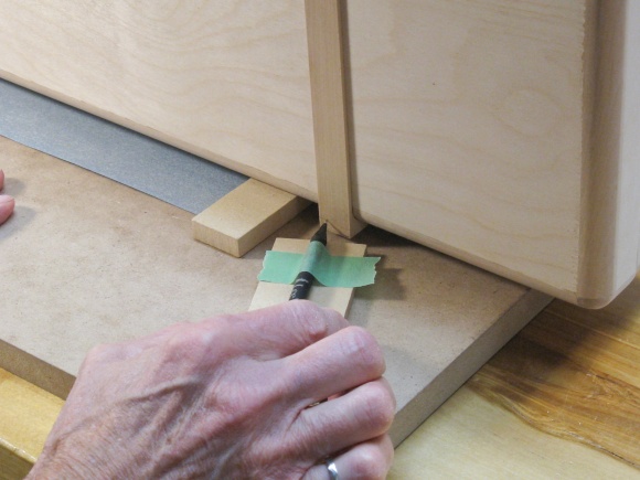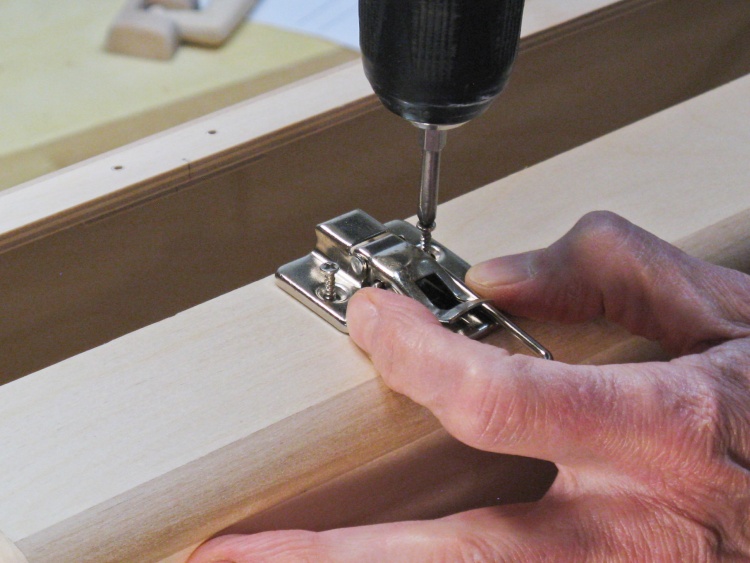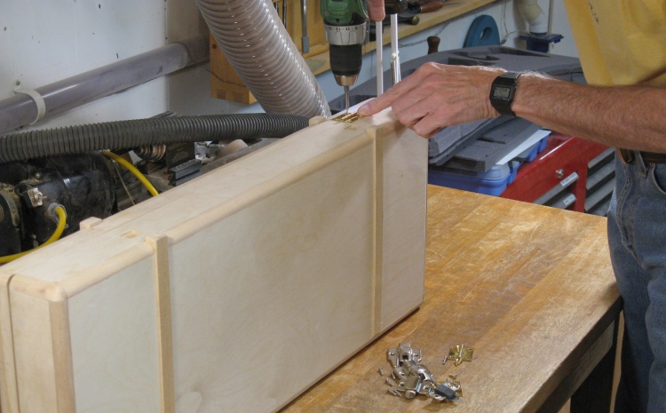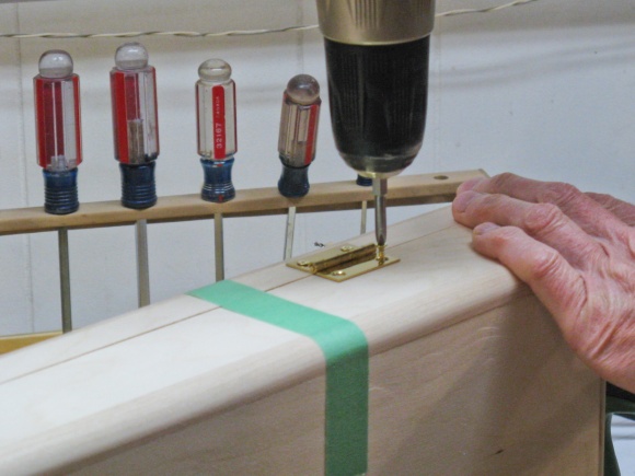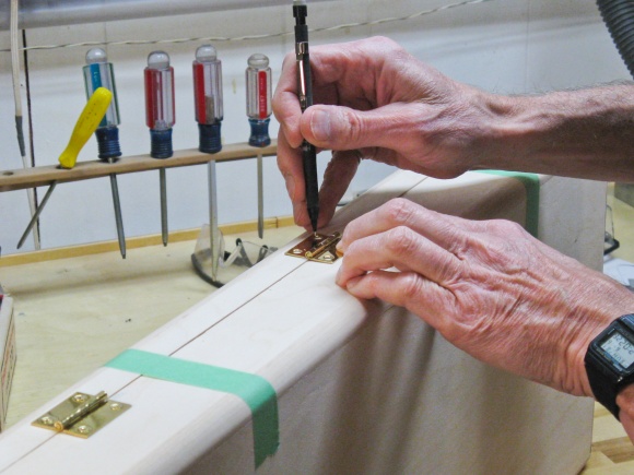 I thought I would install the hardware and see how things went together. Here I'm marking a hinge hole before drilling a pilot hole and installing the screws.