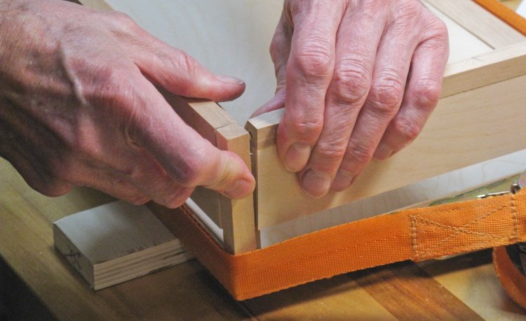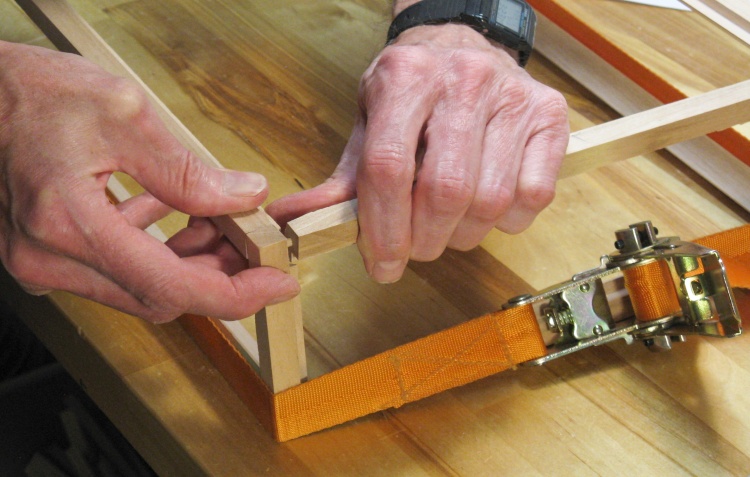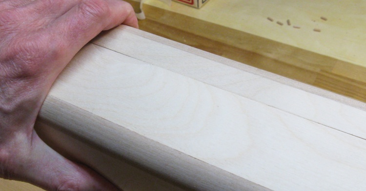The ends of the frame rails are end grain which does not glue well, so I added some small pins to increase corner strength a bit. The pins need to be pretty small - 0.15" diameter - and pretty short - 1/2" overall - but even if they have little effect on the strength, they act as rail-to-corner alignment guides.