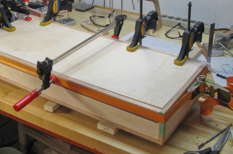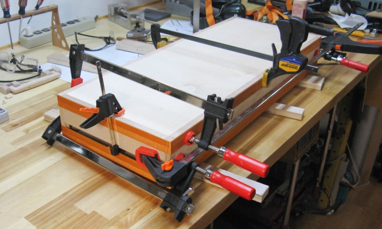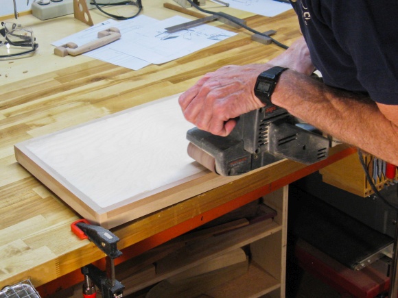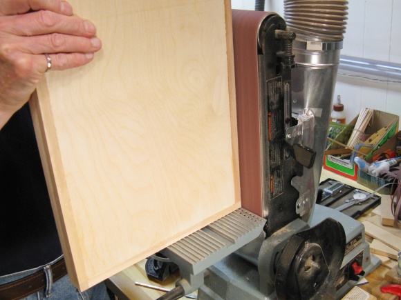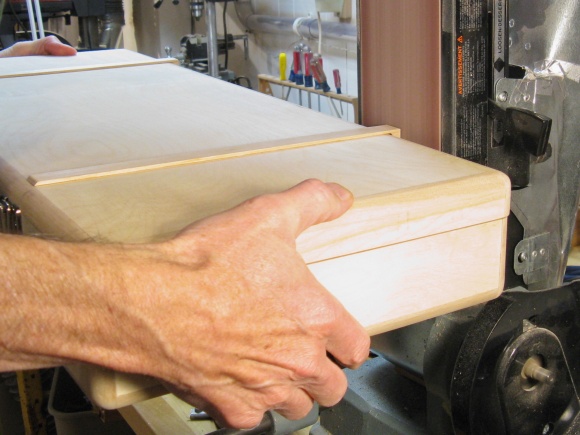 The case outsides were not perfectly smooth since the 1/4" plywood was actually 6mm so it didn't come quite flush due to the 1/4"-deep notches in the frame. But that was good since it meant I could sand a bit off the frame and bring it exactly flush with the plywood. I used the belt sander for the corners and short sides and then resorted to the little-used hand-held belt sander for the center of the long sides.