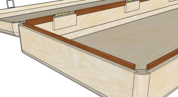 I formed some feet from left-over 3/4" pieces from the frame, routing a concave section to fit over the rounded edge of the case. Then those feet were glued to the straps and the combined pieces glued to the case.