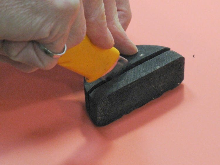 I decided the elastic force would be provided by dense sponge. I sacrificed a sponge puck on the altar of quality latching action and here I'm starting to slice out its still-beating heart a suitable chunk.