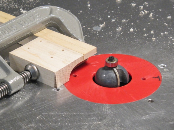 Next was (finally) rounding off the corners of the case. A 1/2" rounding bit on the router table did a nice job here. The wood scrap clamped to the end of the side prevents splintering at the corner.