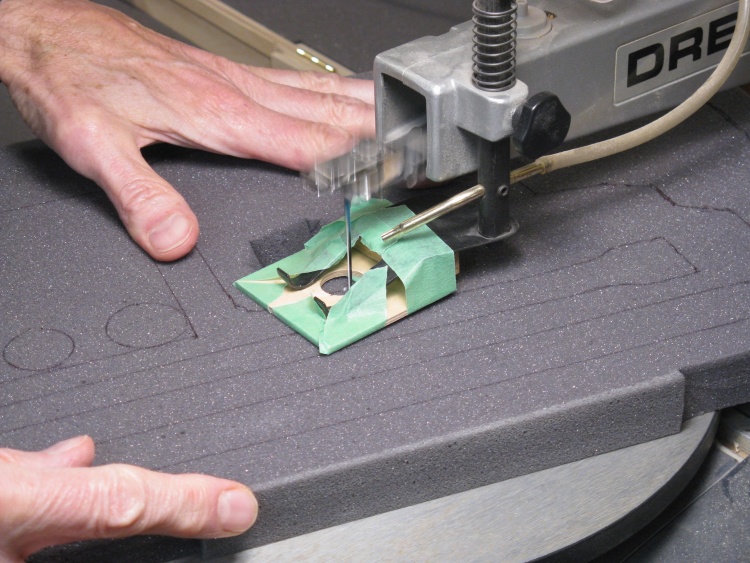 The knife I originally used to cut the foam was fine for straight lines but I needed a better method for the curved cutouts and settled on the bench-top jigsaw. I found that even a fine-toothed blade made rather rough cuts so I ground the teeth off a blade until it had a smooth sharp edge. That worked really well and gave nice clean cuts.
