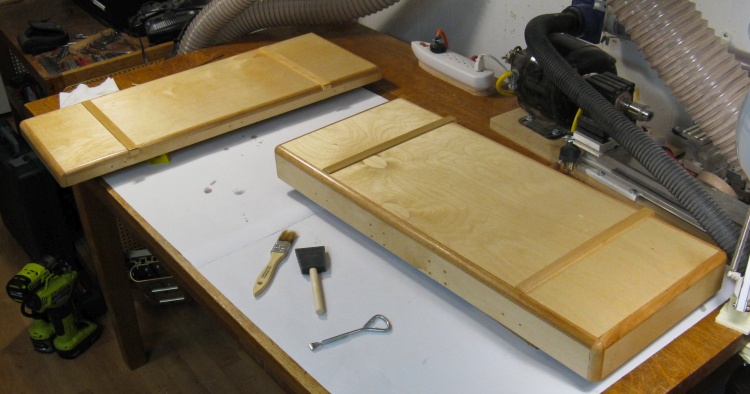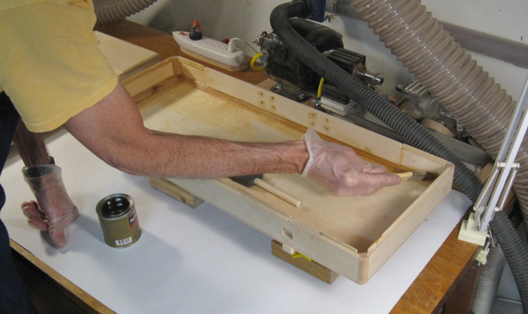 I used my normal Fast-Dry Polyurethane varnish and this shot shows the first coat going on to the inside of the base.